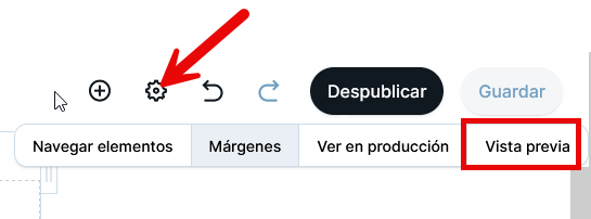 5. Para ver cómo está quedando tu diseño, haz clic en el ícono de la rueda que se encuentra en la esquina superior derecha del editor, y seleccionar la opción «Vista previa» que aparece en el desplegable.