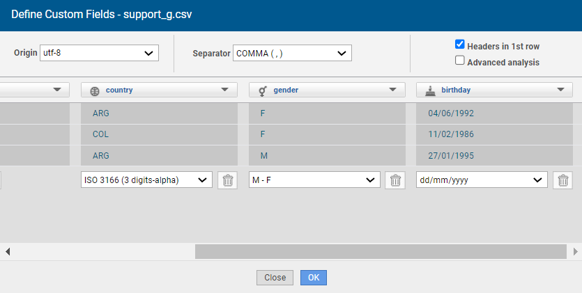 • Si en tu base de datos cuentas con el dato País, ten en cuenta que solo podrás cargar esta información poniendo el código ISO en esa columna.