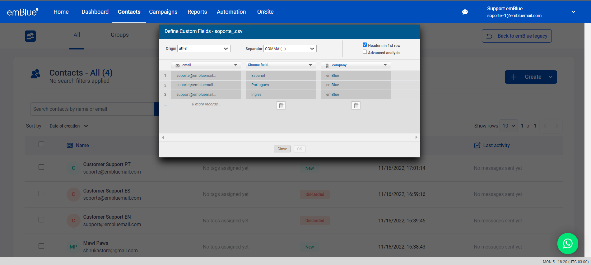 El sistema reconocerá los campos como nombre, apellido, email o edad de forma automática. También, es capaz de reconocer los campos personalizados (tanto los de emBlue como los que el usuario crea) si el título de la columna de nuestro archivo CSV es idéntico al campo personalizado creado en emBlue.