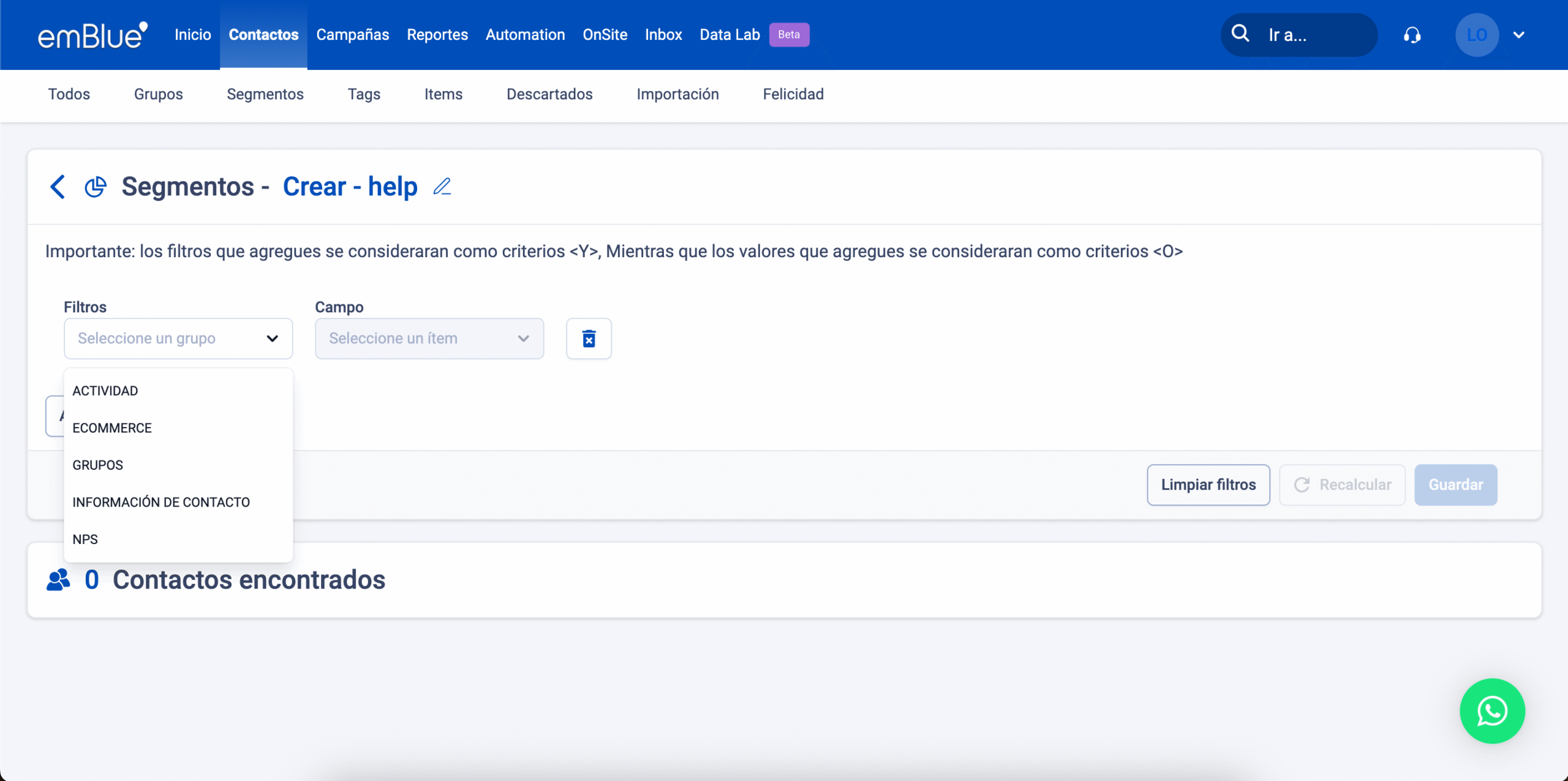 En la ventana emergente, verás todos los tipos de segmentos: personalizados, recetas emBlue o eCommerce (en caso de tener alguna integración activa).