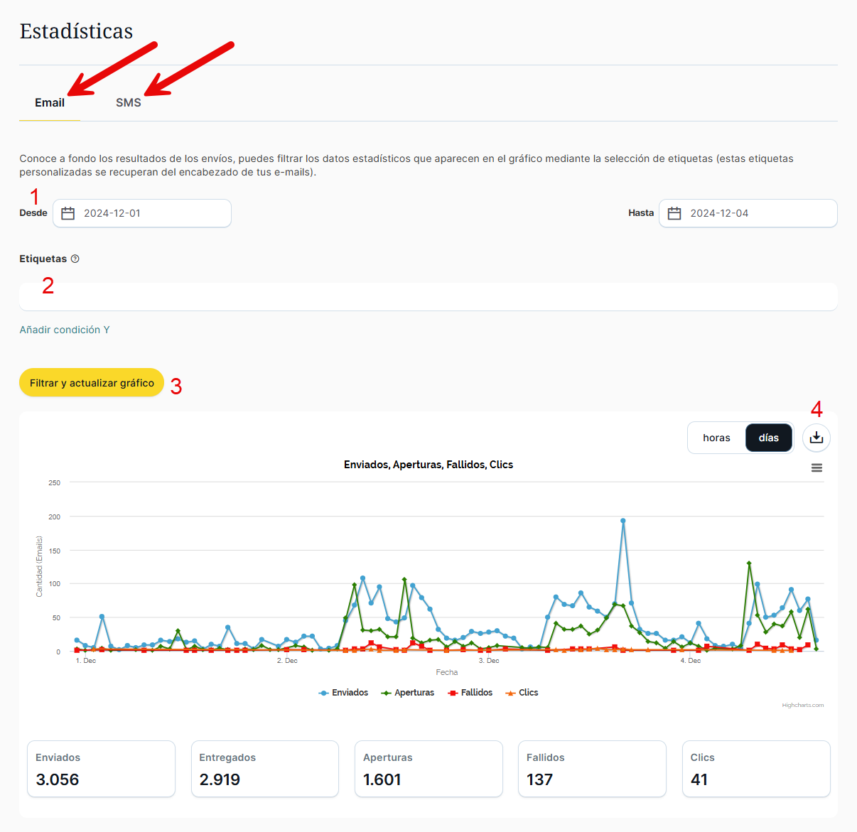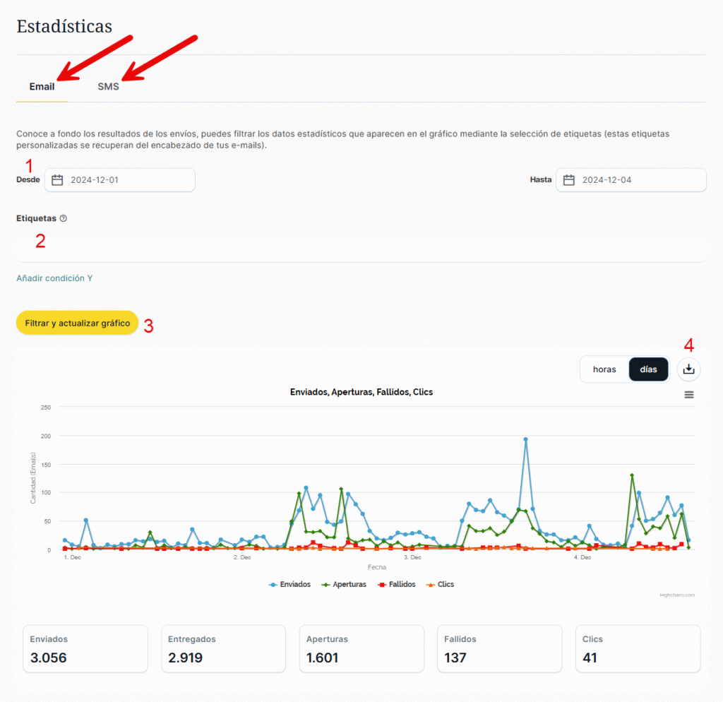 Desde la barra lateral izquierda en la sección Email/SMS Transaccional tienes la opción de «Estadísticas» en el que hay dos pestañas para ver las estadísticas de Email o de SMS (por defecto sale Email).