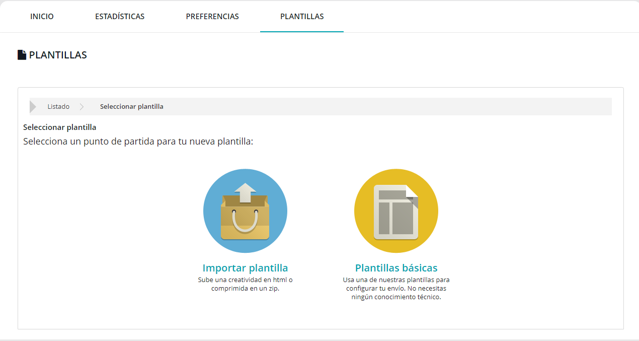 Tienes la opción de importar un html (editable con nuestro editor WYSIWYG) o bien utilizar una plantilla básica (editable con nuestro editor Drag & Drop).
