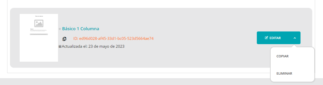 Comparte este post: Generic selectors Exact matches only Search in title Search in content Post Type Selectors Índice de este artículo (MDirector) Listado de plantillas Índice de este artículo En la sección Plantillas puedes visualizar el listado de plantillas que tienes disponibles, con una miniatura, su nombre, e identificador. Con el botón de la derecha de cada plantilla puedes editarla, copiarla o eliminarla. Comparte este post: PrevPrevio(MDirector) ¿Qué son y para qué sirven? Siguiente(MDirector) Edición de plantillas transaccionalesNext (MDirector) ¿Cómo puedo crear filtros de presión de marketing? Leer más ➜ (MDirector) Cómo solicitar la eliminación de cuenta Leer más ➜ (MDirector) ¿Cómo reportar Spam? Leer más ➜ (MDirector) ¿Qué hago si no me ha llegado el código temporal de acceso (OTP) a mi email? Leer más ➜ ¿Todavía tenés dudas? Contacta a un experto