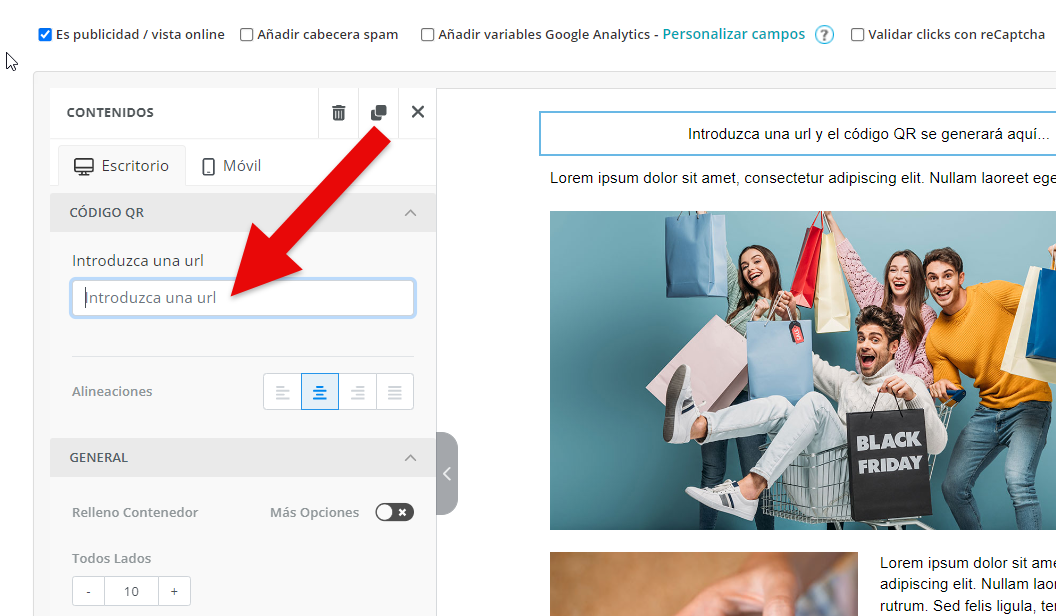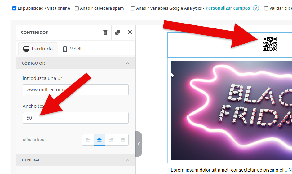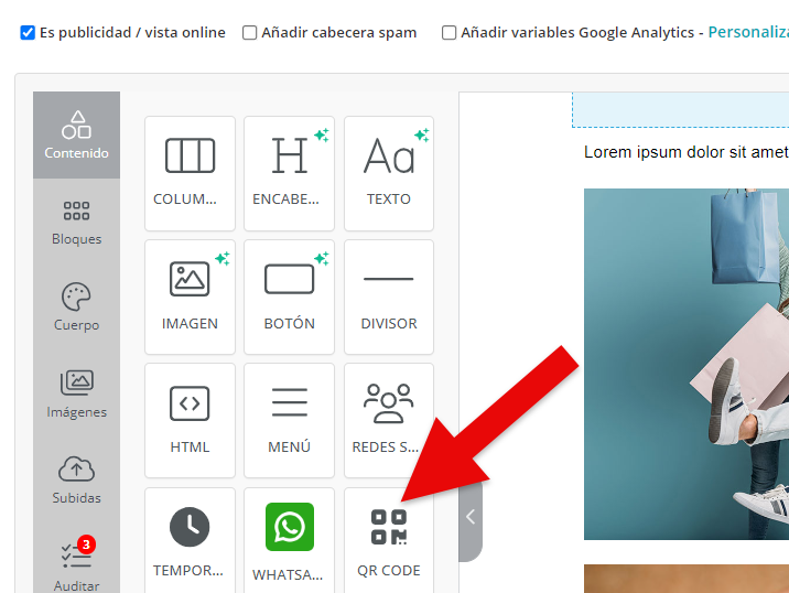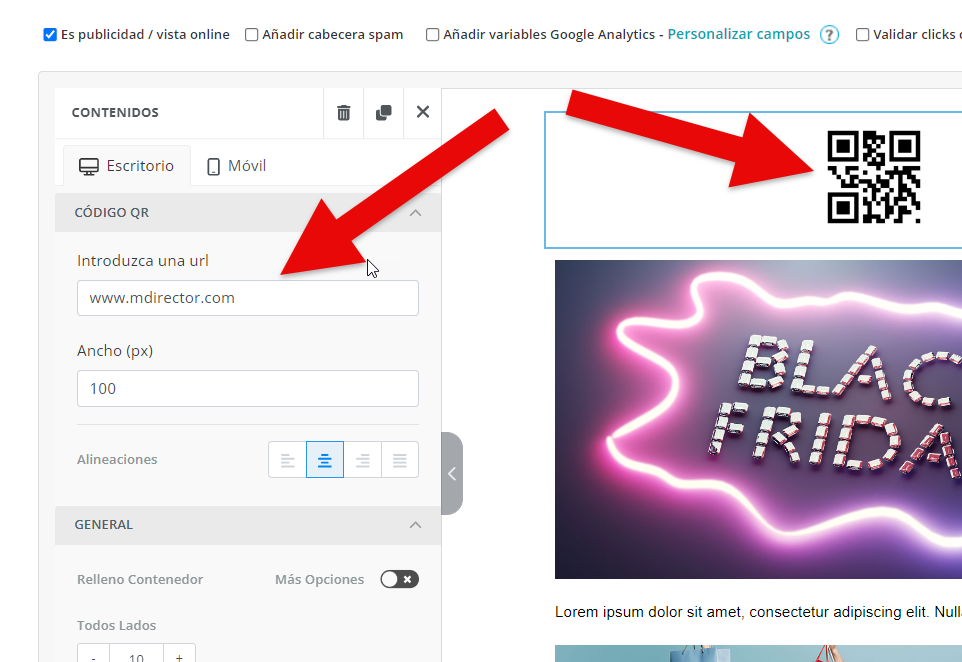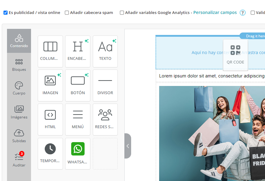 El Nuevo Editor Mejorado de MDirector ofrece la posibilidad de incorporar un código QR en la creatividad del envío de Email Marketing. Para colocarlo en la misma basta con arrastrarlo desde el panel de «Contenido» hasta el bloque donde queramos agregarlo.