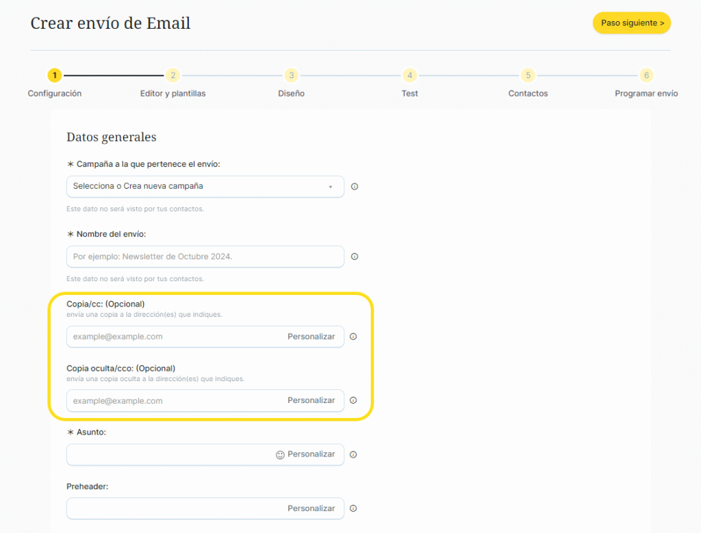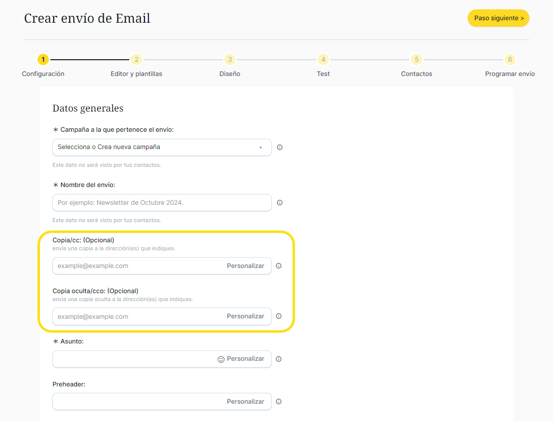 Por defecto, todos los envíos se crean sin CC / CCO, sólo se añade CC / CCO cuando rellenes este campo con la dirección de email al que le llegará en copia. Puedes hacerlo de 2 formas: