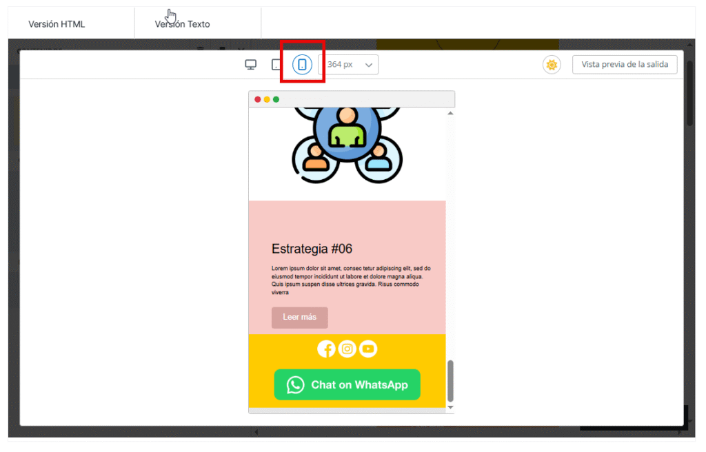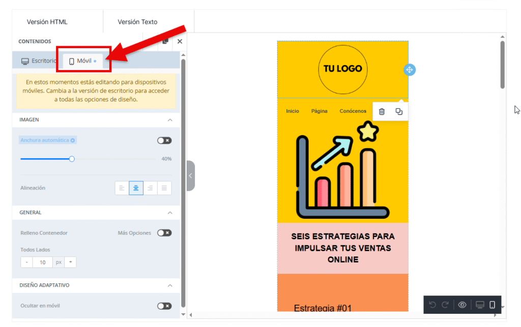 Por defecto, al abrir una plantilla en el editor mejorado, se mostrará la vista de escritorio. Para cambiar a la versión móvil, basta con seleccionar cualquier elemento de la creatividad y elegir la pestaña Móvil en el panel lateral izquierdo.