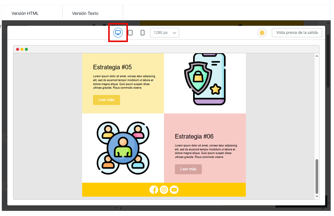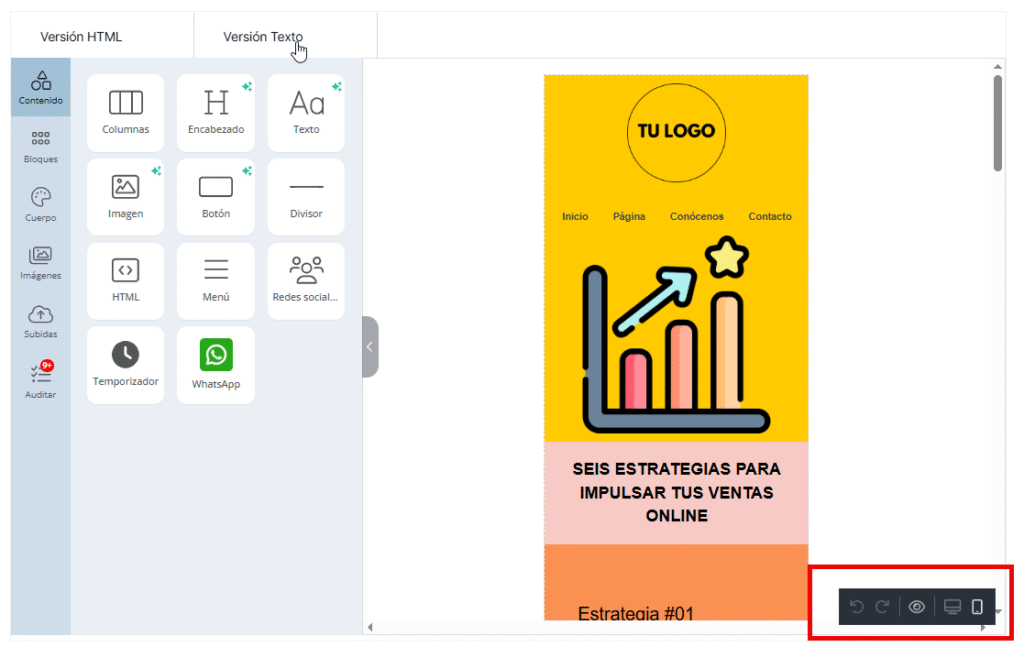 Al editar una plantilla de email en el editor mejorado de MDirector —ya sea desde la creación de un envío o desde el apartado Mis plantillas en los módulos de Email Marketing o Email Transaccional— es importante tener en cuenta que existen dos versiones de la plantilla: la de escritorio y la versión móvil.