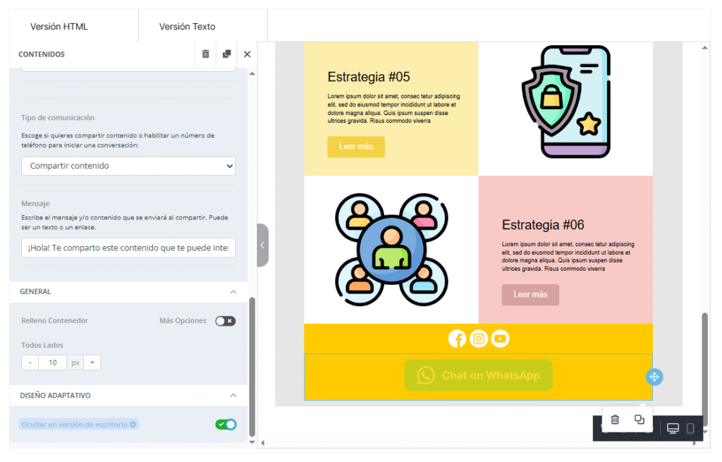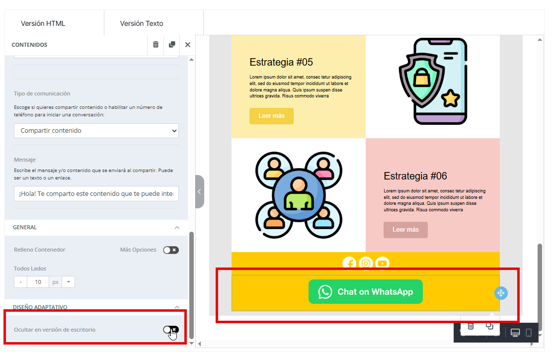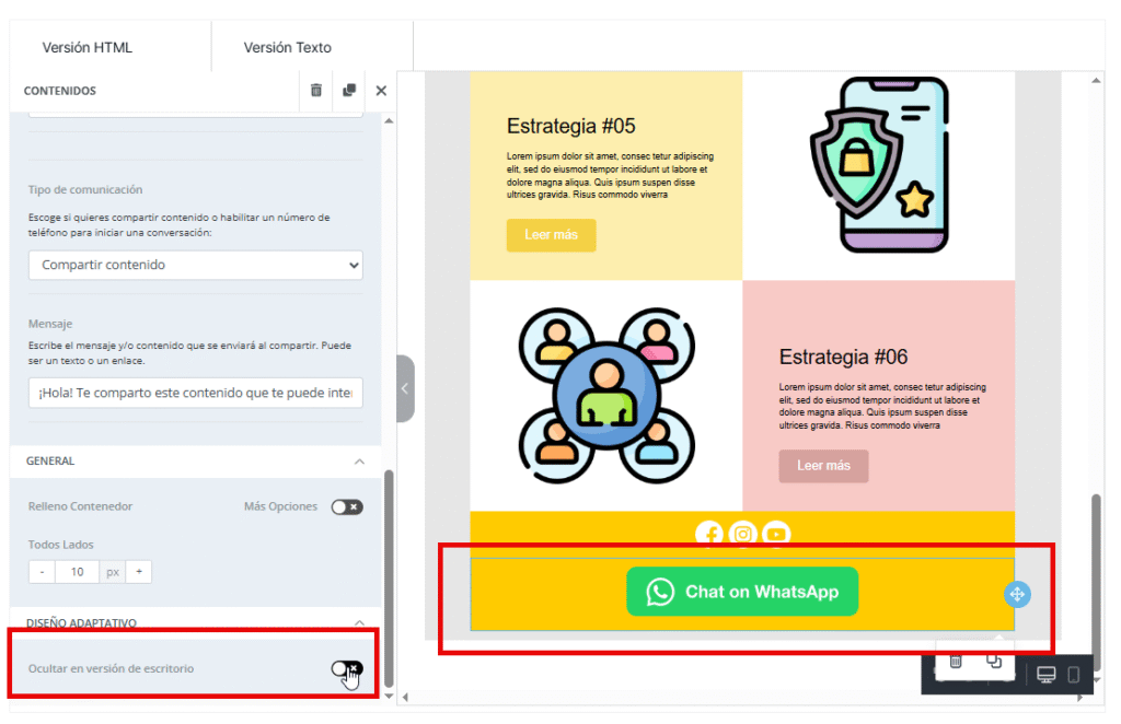 Para acceder a esta función, seleccionaremos el elemento —o el bloque, si queremos ocultar un bloque completo— en la vista donde deseamos ocultarlo. Luego, en la barra lateral izquierda, encontraremos la opción Ocultar en la versión de escritorio / Ocultar en móvil. Al activar esta opción, el elemento se volverá translúcido en la plantilla para indicar su presencia, pero no se mostrará en la bandeja de entrada del destinatario.