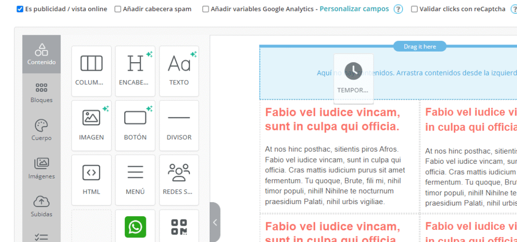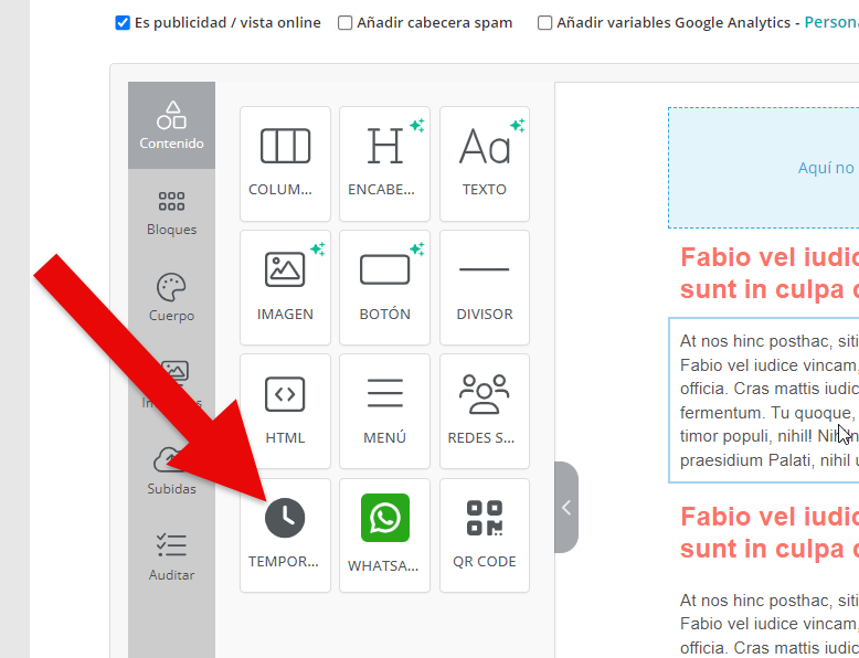 El Nuevo Editor Mejorado de MDirector ofrece la posibilidad de incorporar un temporizador —o, lo que es lo mismo, una cuenta atrás— en la creatividad de un envío de Email Marketing. Para colocarlo en la misma basta con arrastrarlo desde el panel de «Contenido» hasta el bloque donde queramos agregarlo.