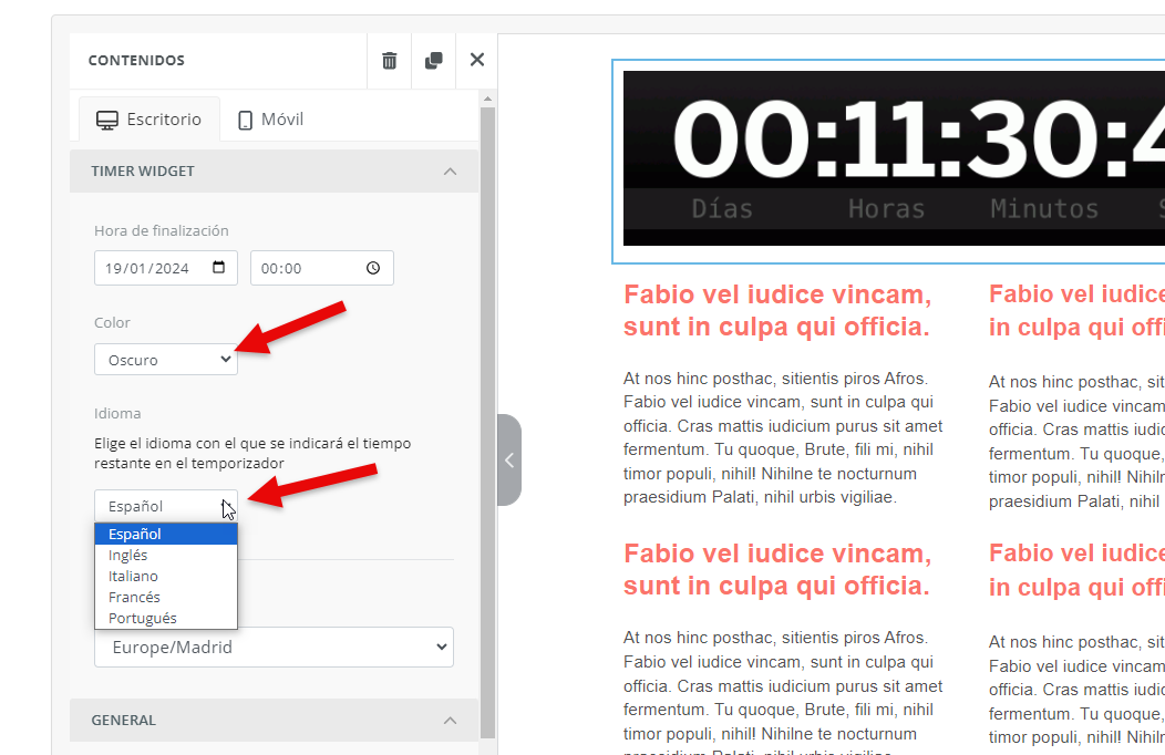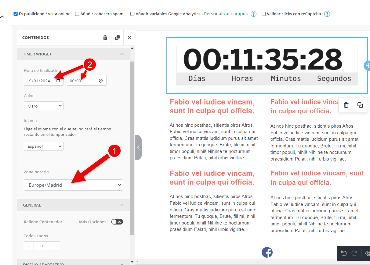 En el menú correspondiente a este widget, debemos seleccionar, en primer lugar, la zona horaria a la que va a apelar esta cuenta regresiva y, en segundo, la fecha y hora del evento.