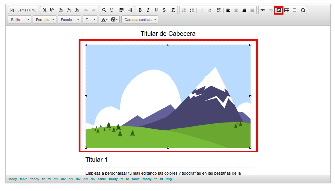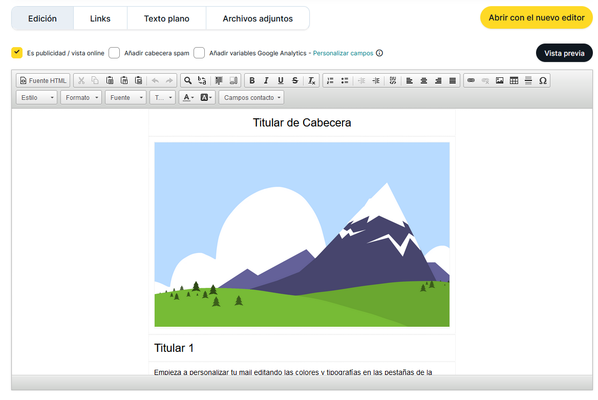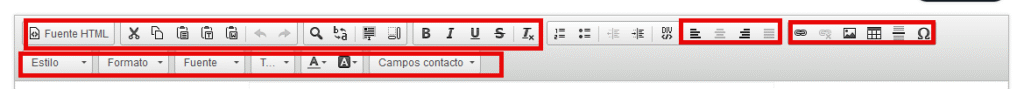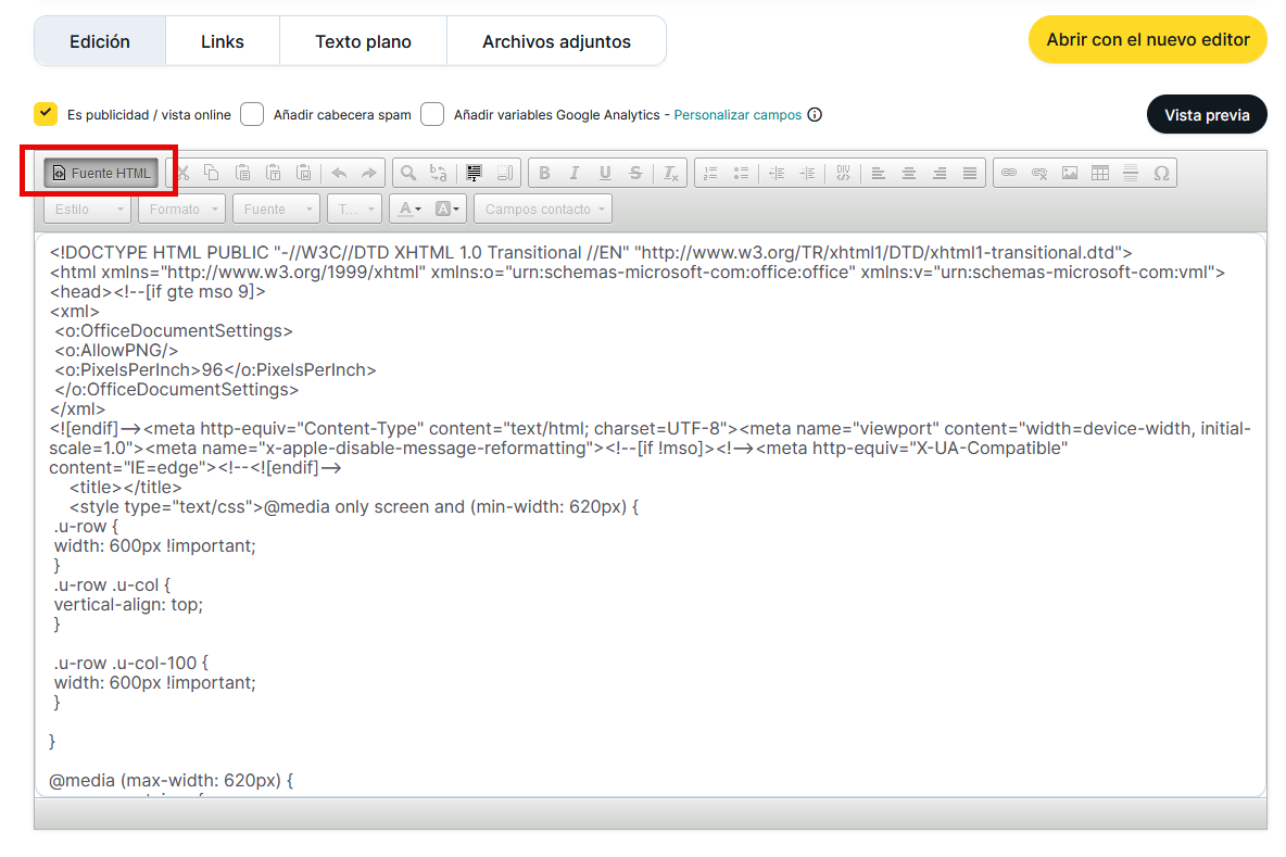 Una vez se haya insertado la creatividad, con el editor HTML podrás editar los elementos de texto, imagen y el código en general editando la “Fuente HTML”: