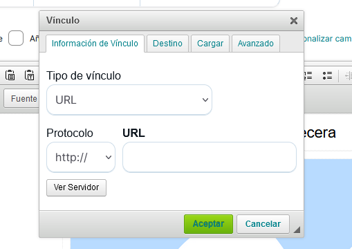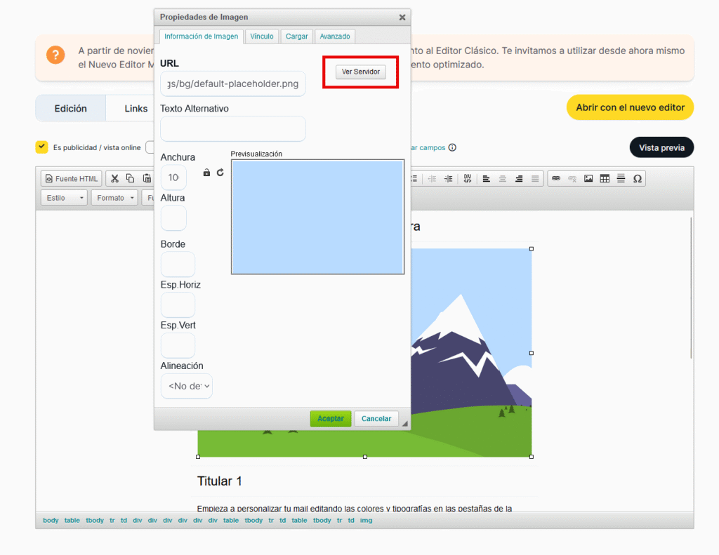 Puedes añadir un enlace a la imagen, editar el tamaño y cargarla desde servidor, al clicar “Ver Servidor”: