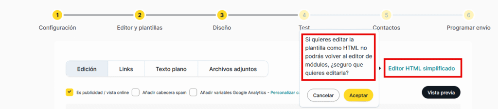En MDirector no es posible crear plantillas híbridas, pero sí pasar del editor Drag&Drop al editor HTML si deseáis añadir elementos más complejos o modificar la estructura predeterminada de alguna de nuestras plantillas: