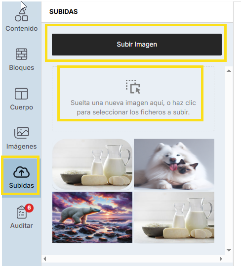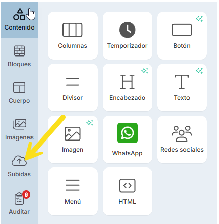 - Ve al menú lateral izquierdo del editor y haz clic en el ícono de la nube que dice ‘Subidas’.