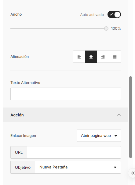 5. Una vez cargada, podrás configurar opciones como el texto alternativo, el enlace de destino, y la alineación.