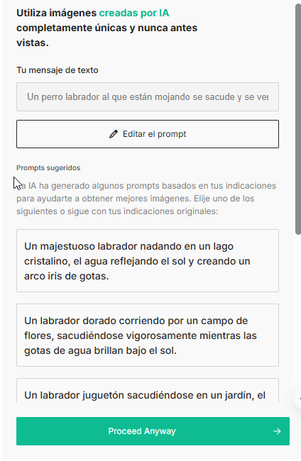4. La herramienta te mostrará otras opciones de descripciones (prompts). Puedes elegir alguna de las sugerencias o pulsar el botón ‘Proceed Anyway’ si prefieres quedarte con tu texto.