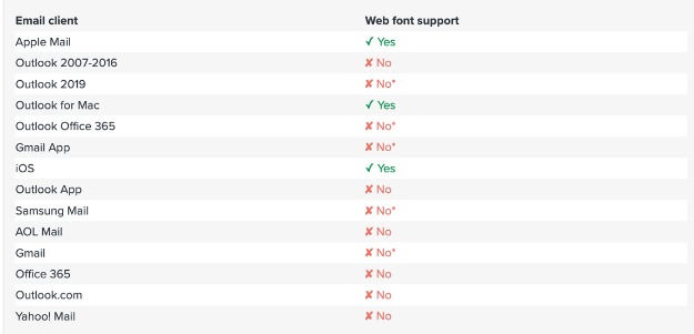 Si bien es cierto es posible añadir Fuentes Web como las de Google Fonts, estas fuentes solo funcionan en algunos clientes de correo electrónico: