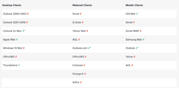 Esto se debe a que el nivel de compatibilidad con los estándares HTML y CSS varía mucho entre los servidores y/o las aplicaciones de correo electrónico, así como el tipo de dispositivo. Una de las grandes diferencias es que si bien podemos añadir media query de flexbox, grid en la web, estas no siempre serán compatibles con el correo electrónico HTML, así mismo JavaScript que es de uso común en el diseño web nunca se puede utilizar para el diseño HTML en emails, porque representa un riesgo de seguridad y como tal cualquier plantilla de email que contenga jvs siempre será descartada por los servidores de correo.