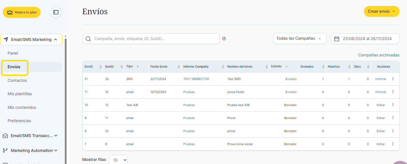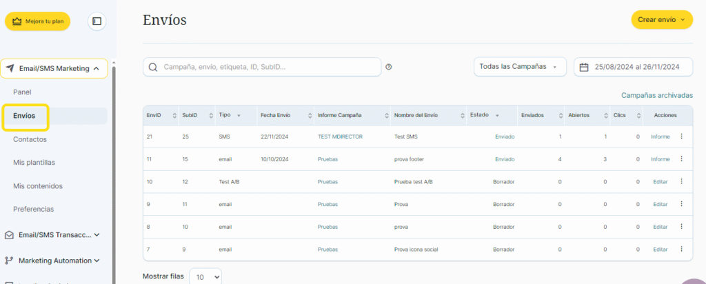 Haz clic desde el menú de navegación lateral izquiero > Email/SMS Marketing > «Envíos»: