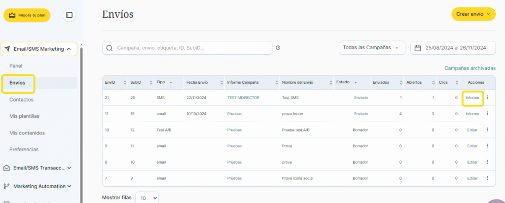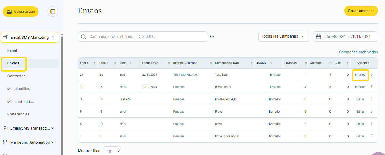 - Haz clic sobre el enlace «Informe» de la columna “Acciones” del envío en cuestión: