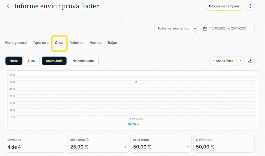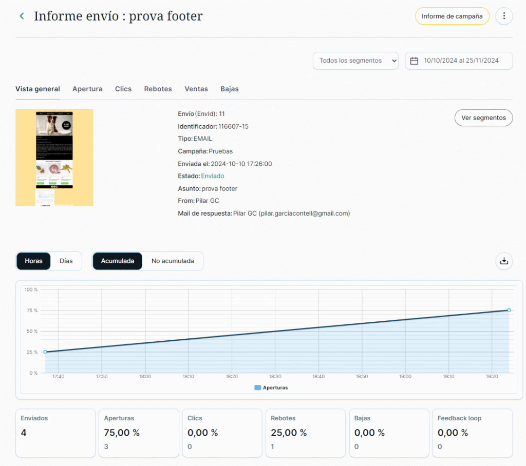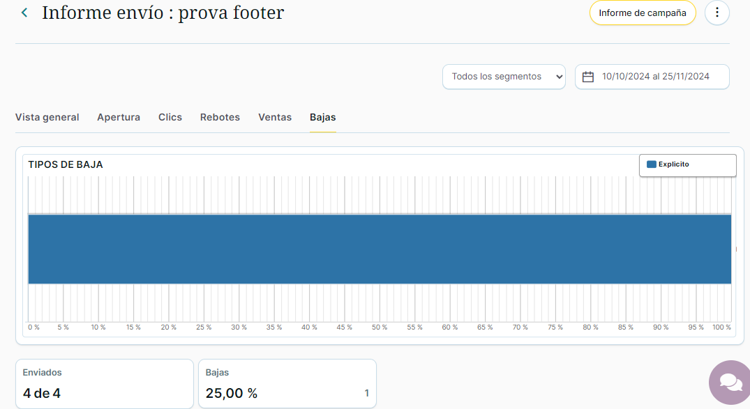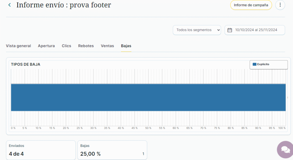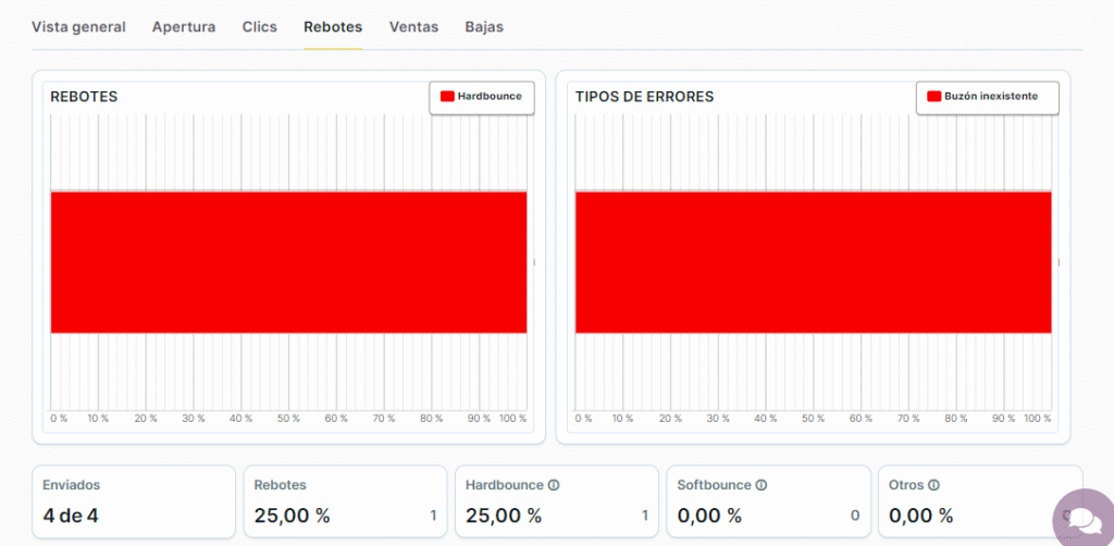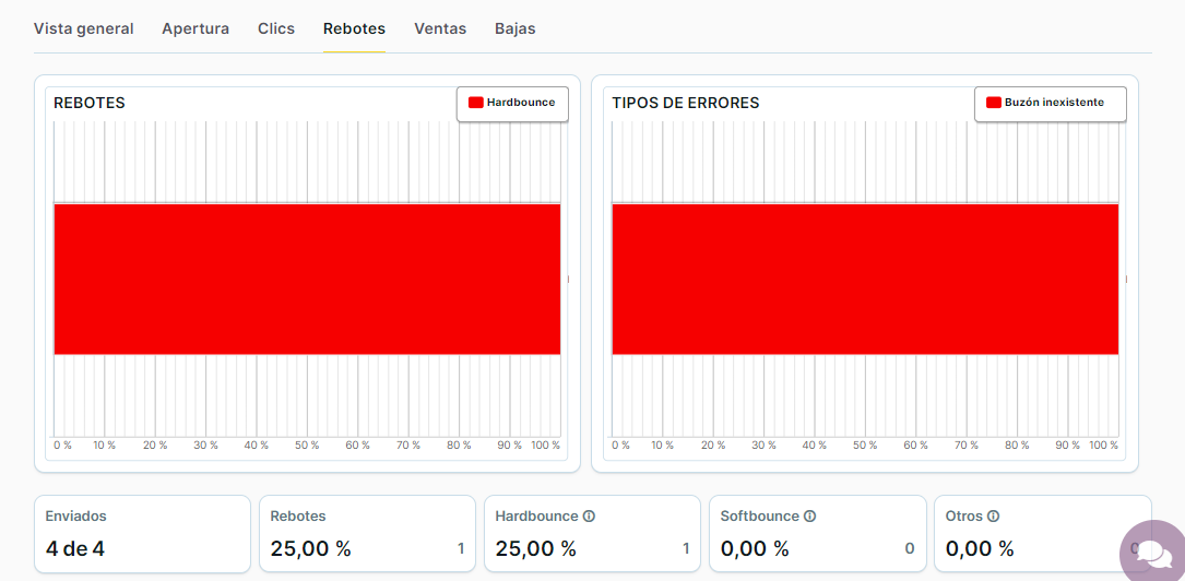 - Datos absolutos y porcentuales de apertura (total), fallidos, ventas, clics (total) y bajas.