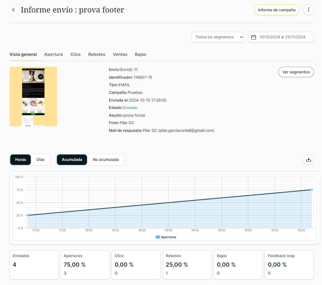 - Vista general de la creatividad enviada, con información acerca de: número de identificador, tipo de campaña, estado, fecha de envío, Asunto, Campaña a la que pertenece, Remitente, email de respuesta y etiquetas utilizadas. Además de una vista previa del gráfico de línea para las aperturas.