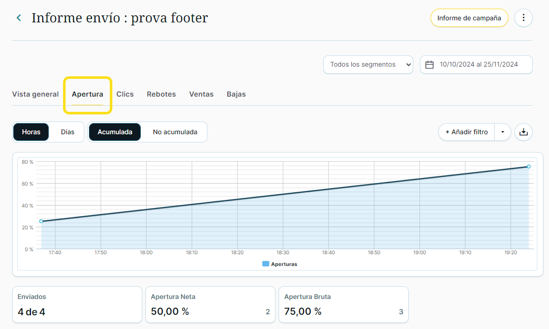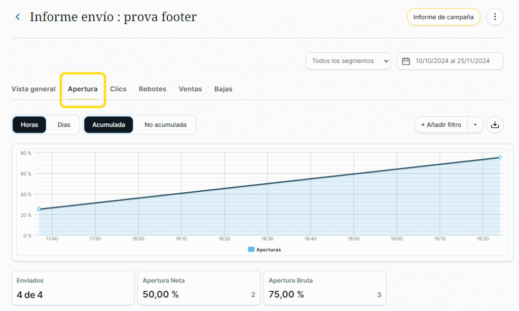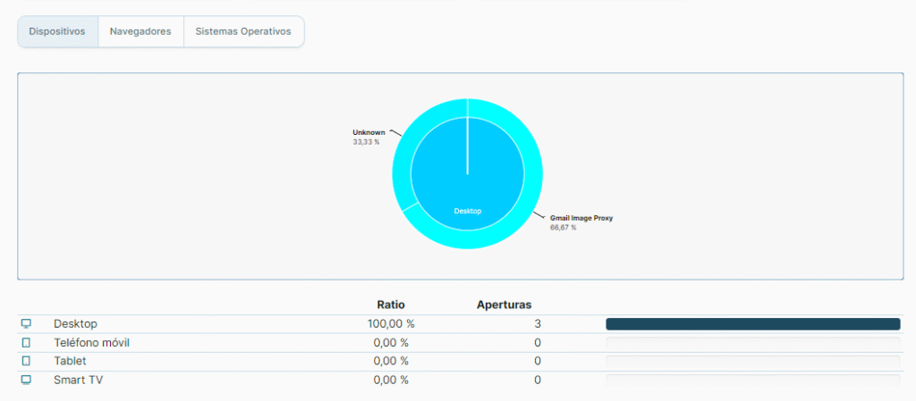 Puedes ver datos totales y porcentuales de aperturas.