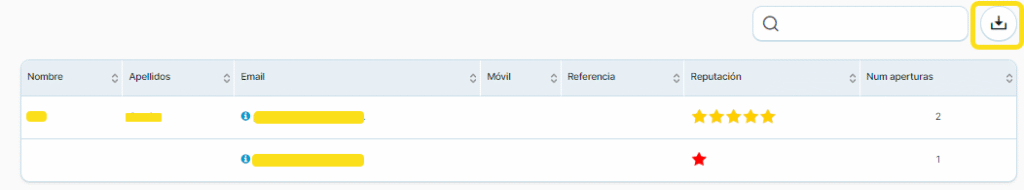 En la parte inferior se muestra listado de todos los contactos que han realizado aperturas, además puede buscar uno en concreto o descargar el listado completo de estos contactos.
