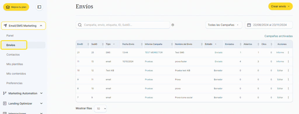 - Ve a la sección Email/SMS Marketing del menú lateral izquierdo y selecciona «Envíos»: