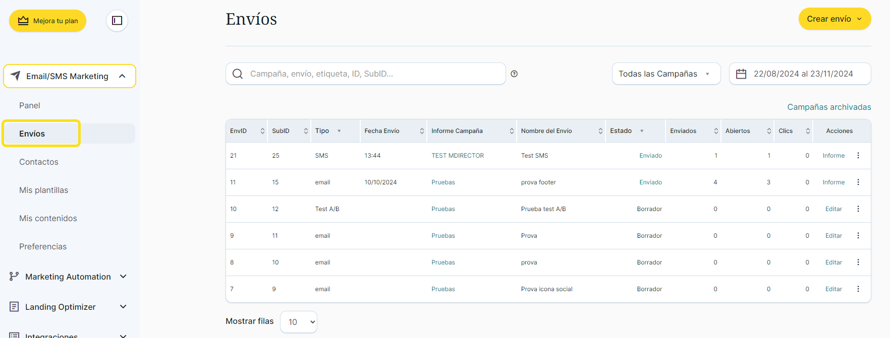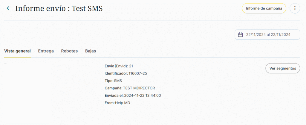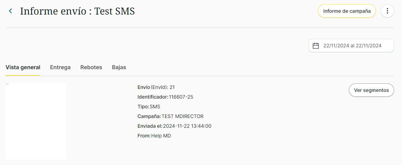- Vista general de la creatividad enviada, con información acerca de: identificador del envío, tipo de campaña, estado, fecha de envío, campaña a la que pertenece y remitente.