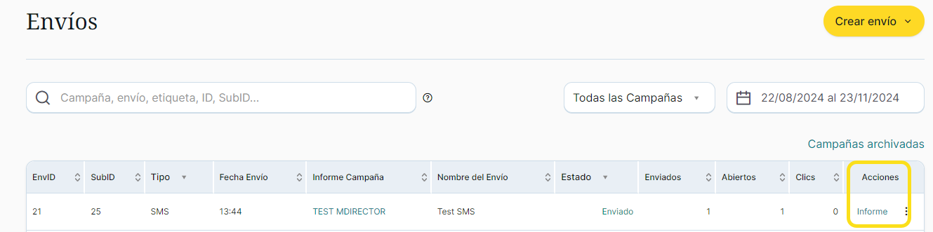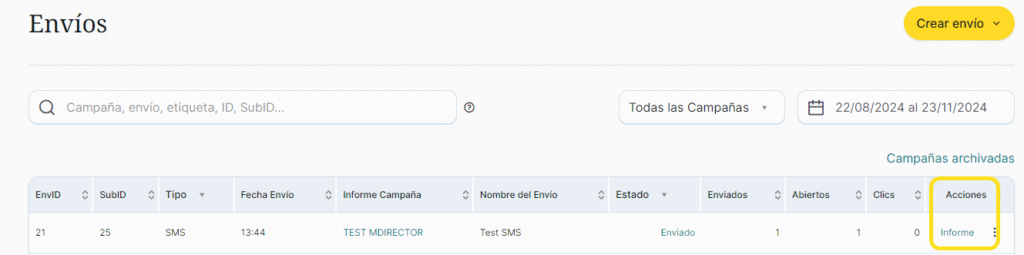 - Haz clic sobre el enlace “Informe” de la columna “Acciones” del envío en cuestión: