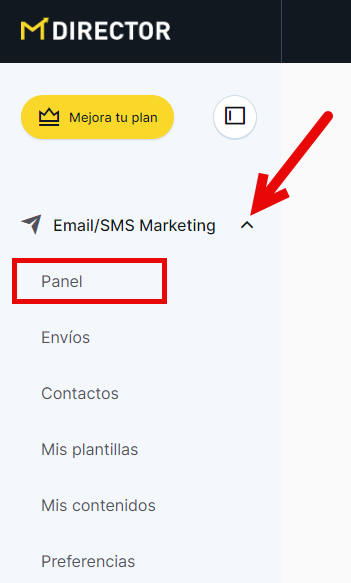 Para acceder al panel de control, tienes que entrar en el apartado de Email Marketing o SMS en tu página de inicio.