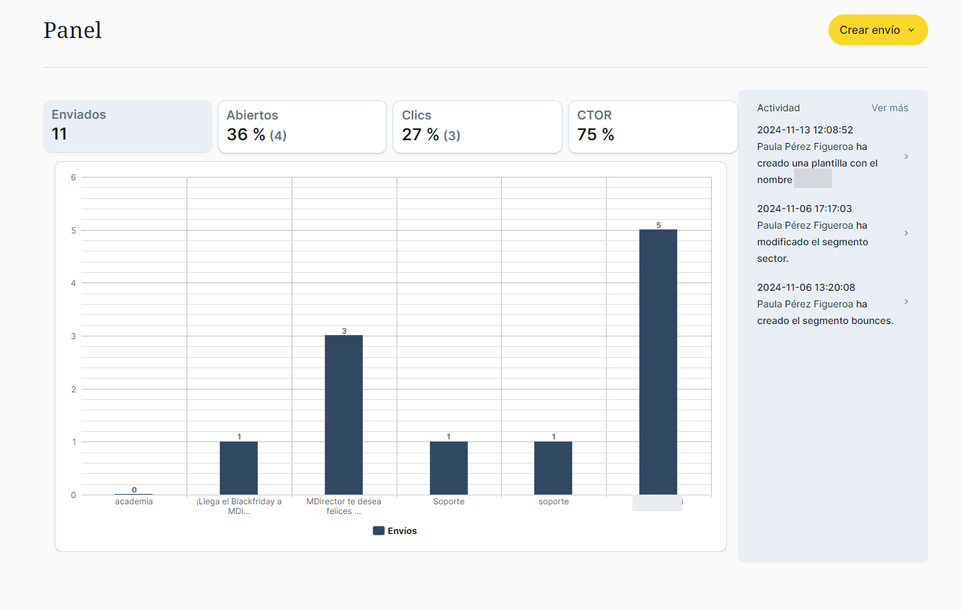 Un Panel de control con información acerca de los últimos envíos, mostrada en un gráfico de barras de fácil interpretación, además de los datos correspondientes al número total de enviados y los porcentajes generales de apertura, clics y CTOR.