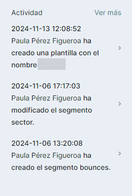 - Actividad. Muestra los últimos 3 movimientos efectuados dentro de la cuenta. Esta información proviene de un log, que se puede visualizar la actividad completa haciendo clic en «Ver más».