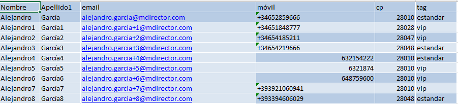 1. Para importar contactos a través de archivos, lo primero es preparar un fichero que contenga los contactos y campos que deseamos trasladar a MDirector. Aquí tienes un ejemplo: