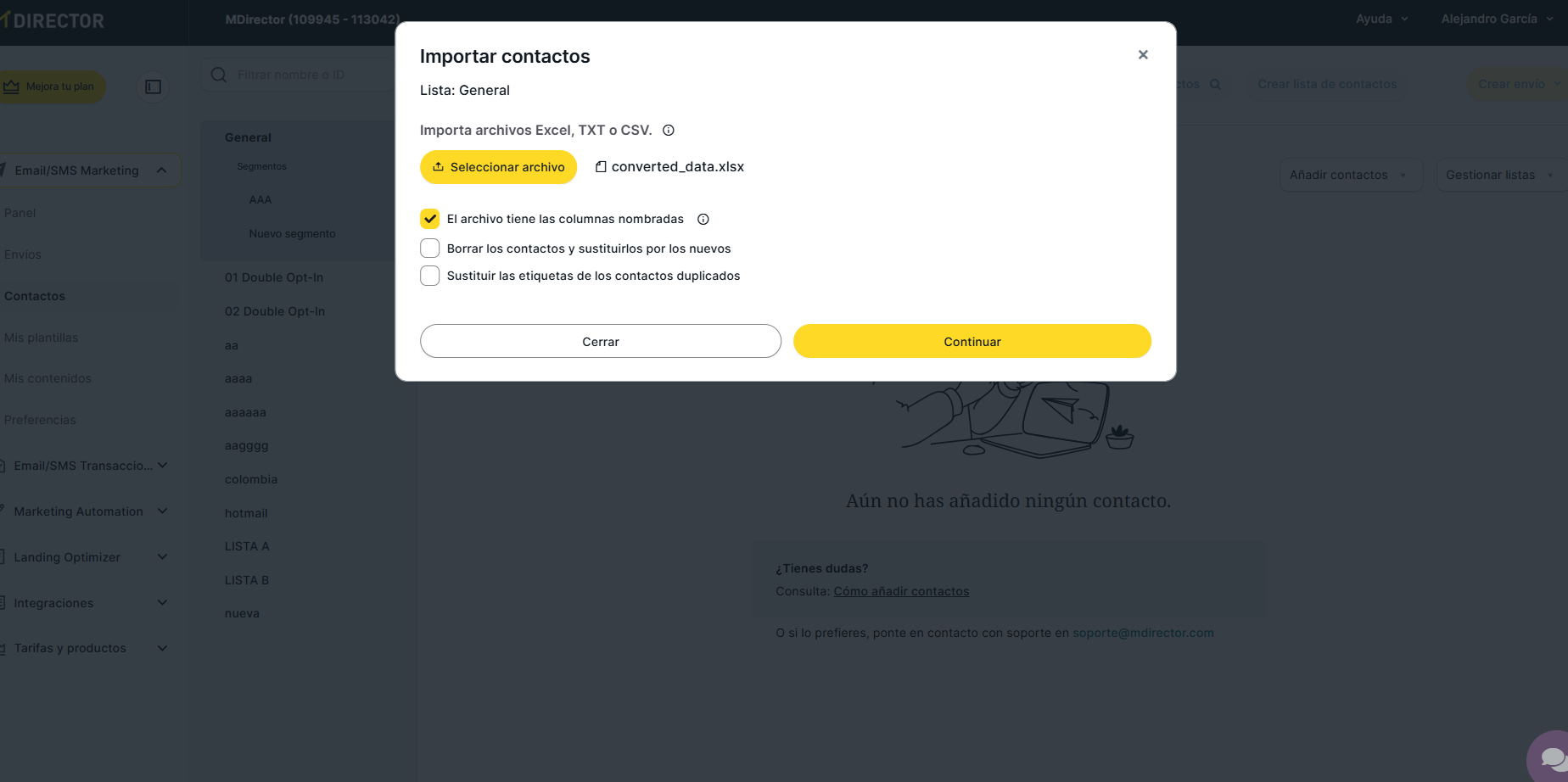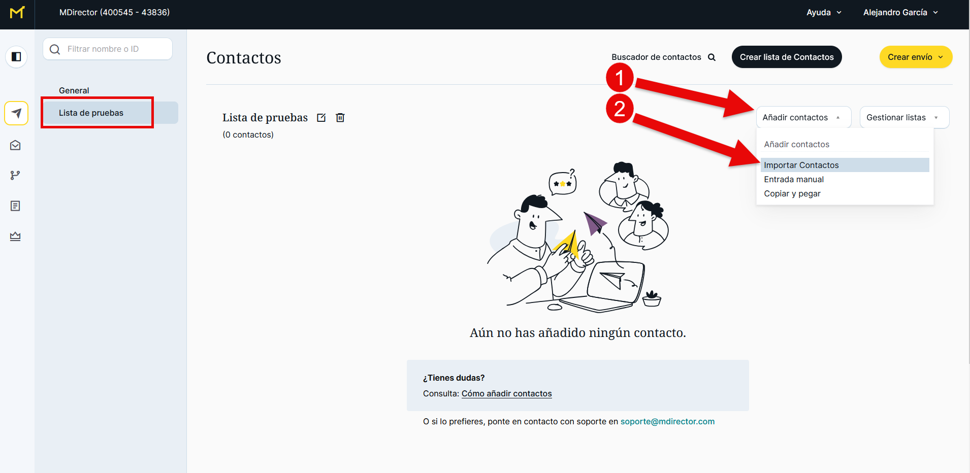 Antes de importar contactos a través de archivos, debes crear una lista de contactos o acceder a la lista «General». Si todavía no has hecho esto y no sabes cómo hacerlo, visita este artículo: https://mdirector.zendesk.com/hc/es/articles/6693916588946-Gesti%C3%B3n-de-listas-de-contactos