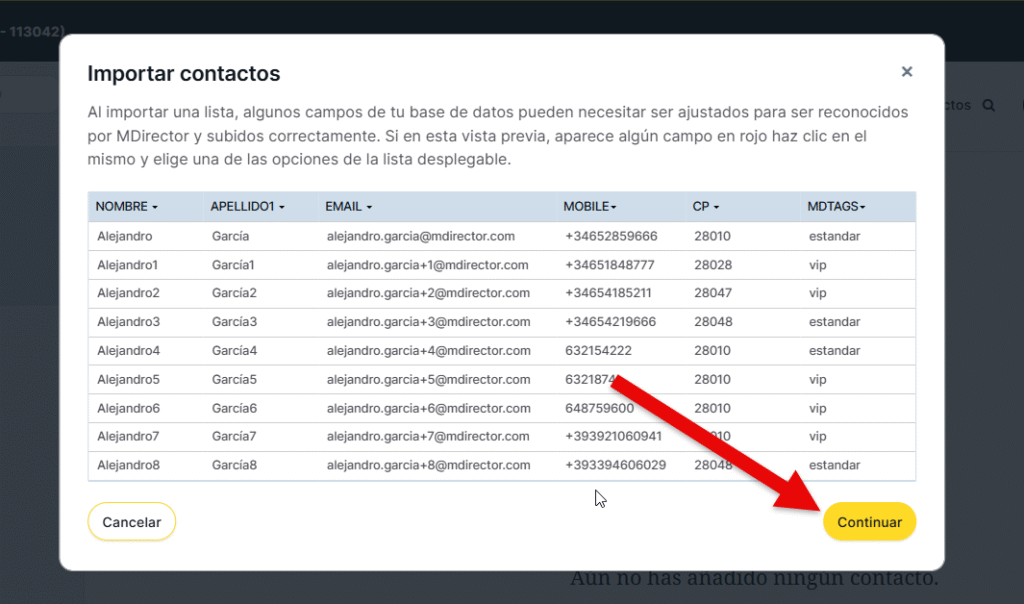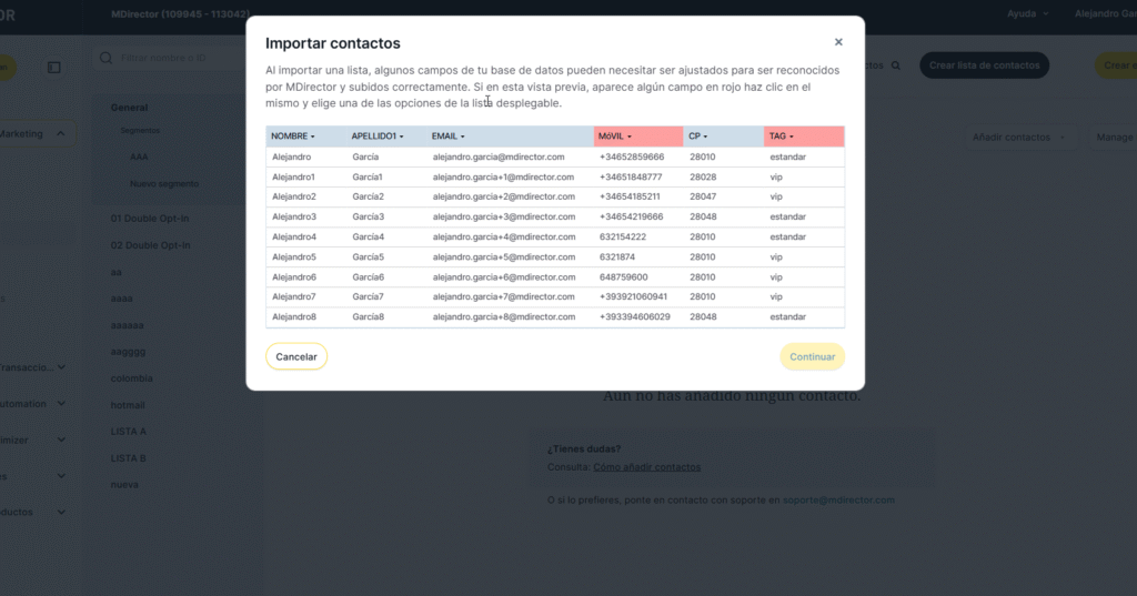 * Revise el formato de los números de teléfono móvil aquí https://mdirector.zendesk.com/hc/es/articles/9228068918556–C%C3%B3mo-importar-contactos-con-n%C3%BAmero-de-tel%C3%A9fono-m%C3%B3vil y los valores o formatos aceptados para  los campos fecha, país, provincia y género en este artículo  https://mdirector.zendesk.com/hc/es/articles/204780612-Tabla-de-c%C3%B3digos-Pa%C3%ADs-Provincia-Genero-y-Fecha para preparar su fichero de contactos a importar.