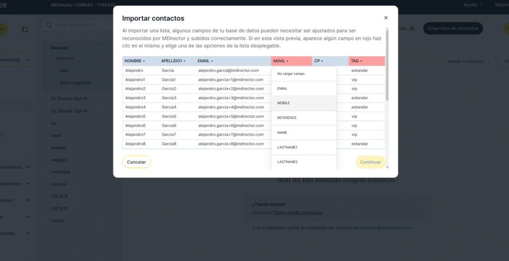 La importación de contactos a través de ficheros es la más adecuada para manejar un gran volumen de contactos y realizar una importación masiva. MDirector reconoce los campos de los ficheros y los traslada a los campos de la plataforma.