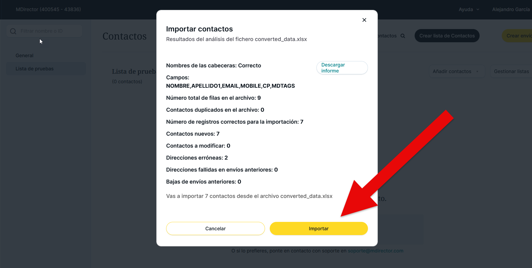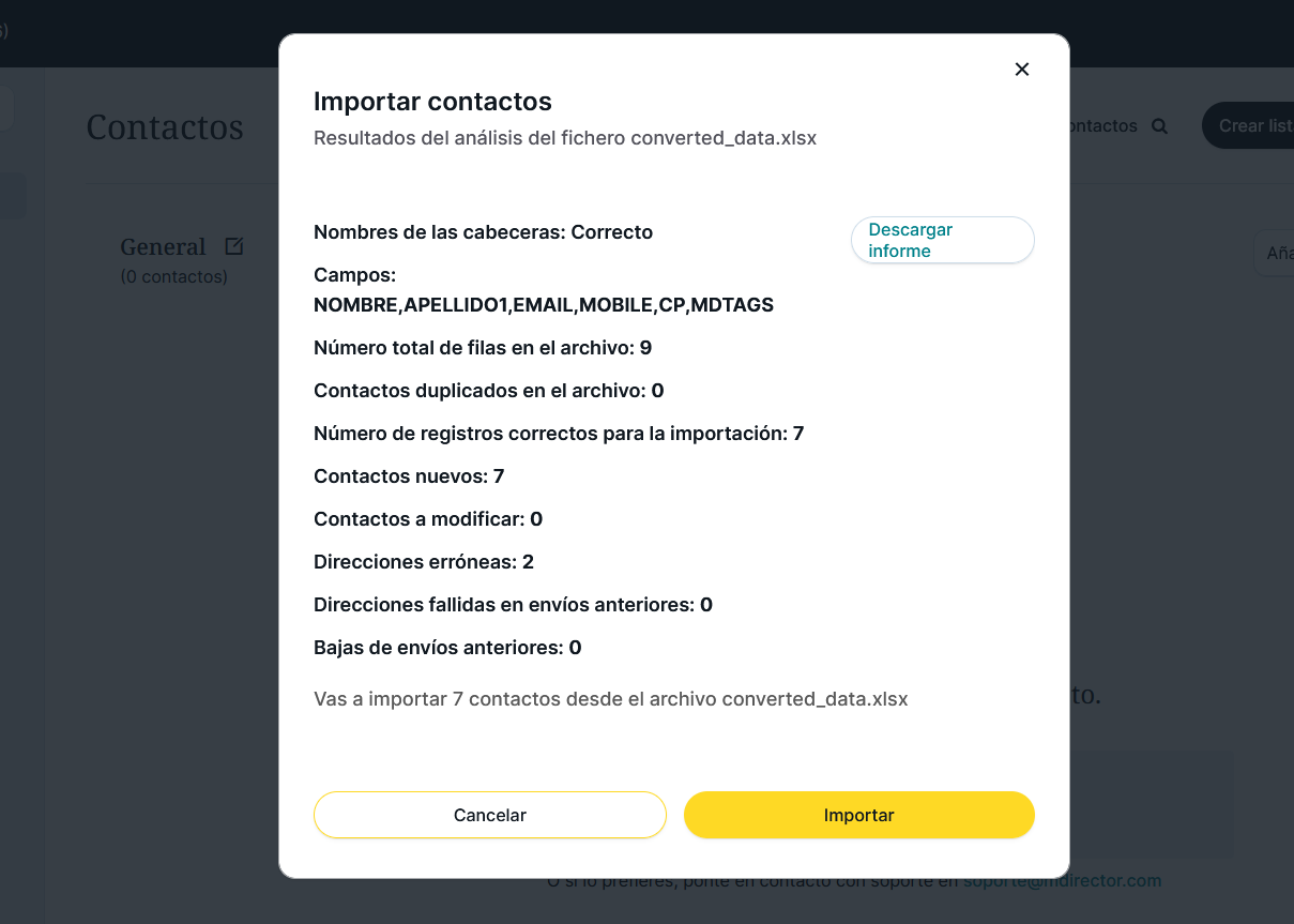 5. MDirector te ofrecerá un resultado final del análisis del fichero de los contactos que estás a punto de importar a la lista.
