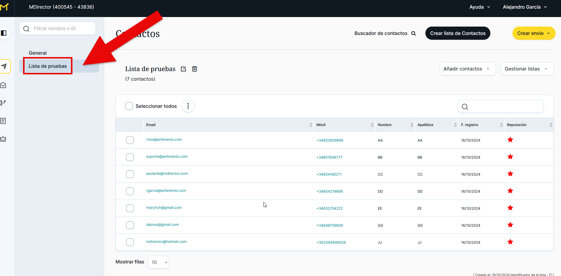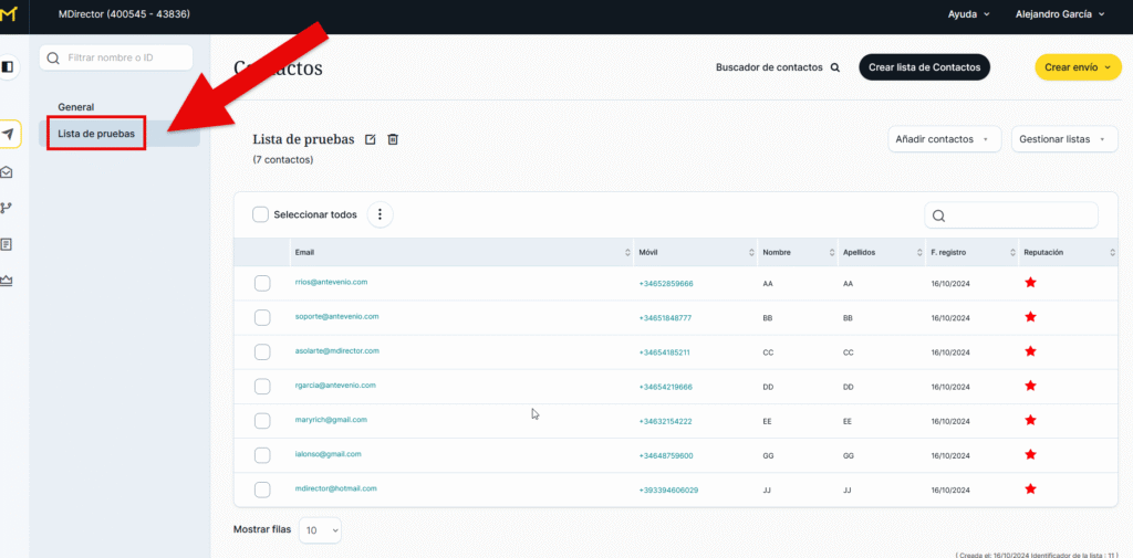 MDirector te llevará directamente a esta lista, pero para consultarla en cualquier momento, recuerda que puedes hacerlo desde el segundo menú lateral que se abre en la sección de «Contactos» del servicio de Email Marketing.