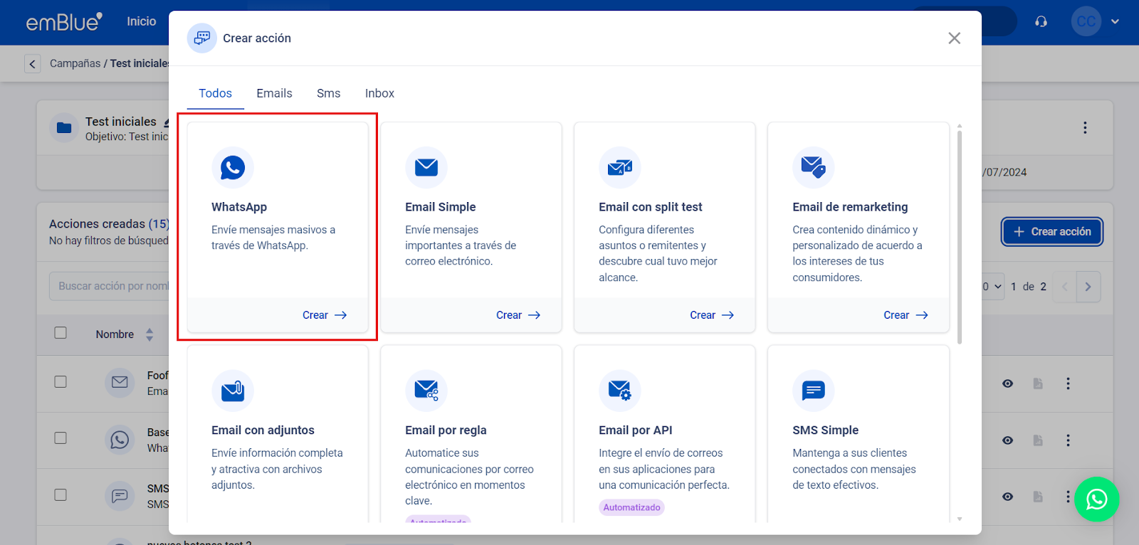 Desde Campañas podrás crear acciones de Whatsapp, debes ingresar a la opción “ Crear Acción” y seleccionar la opción WhatsApp