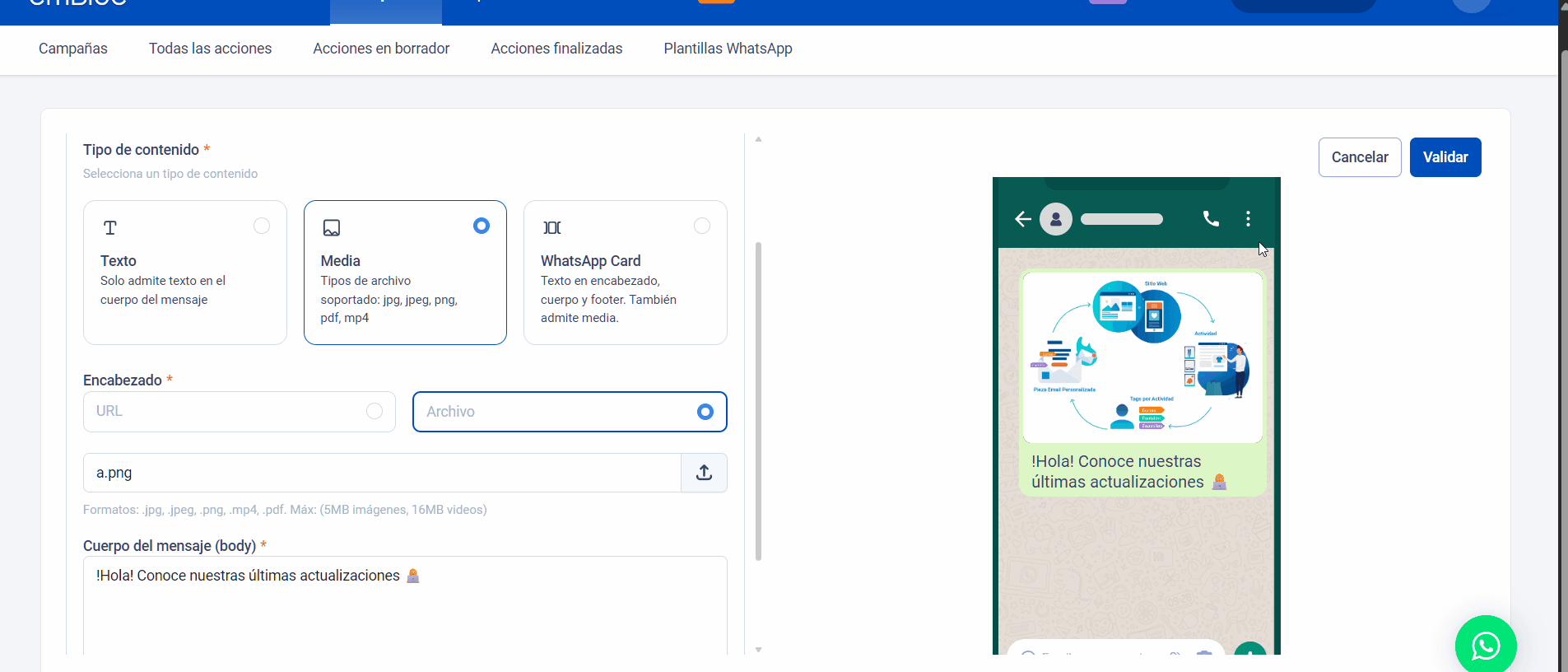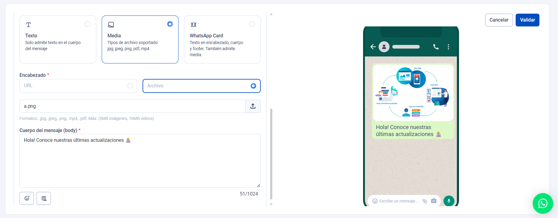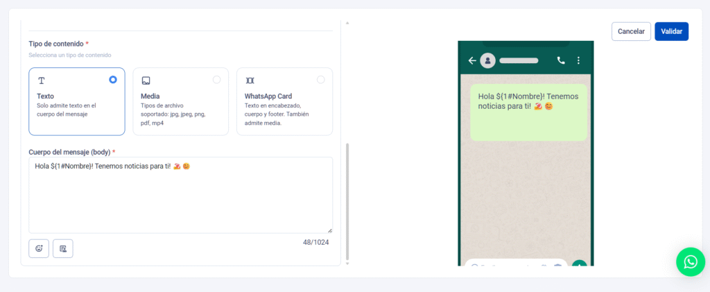 En esta sección puedes definir qué tipo de contenido llevará tu mensaje. Podrás elegir entre los siguientes tipos de contenido (Texto, Multimedia y Whatsapp Card)