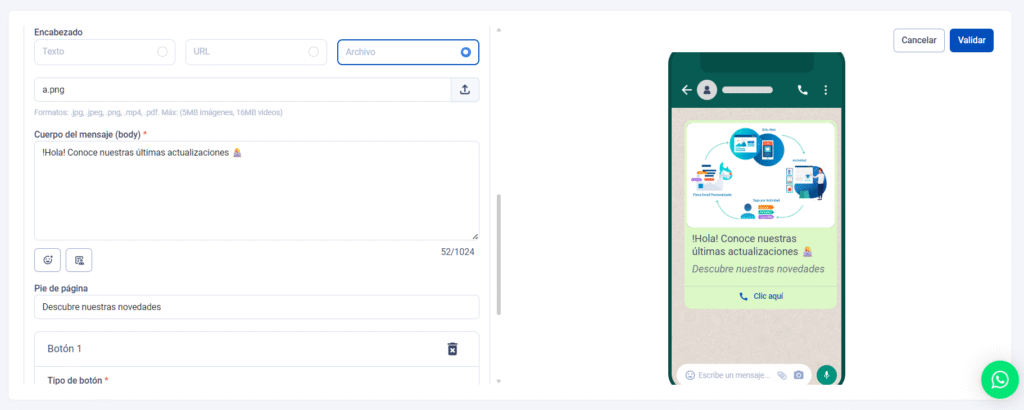 Admite adjuntar archivos en formatos jpg, jpeg, png, pdf o mp4 para complementar el mensaje con imágenes, videos o documentos.