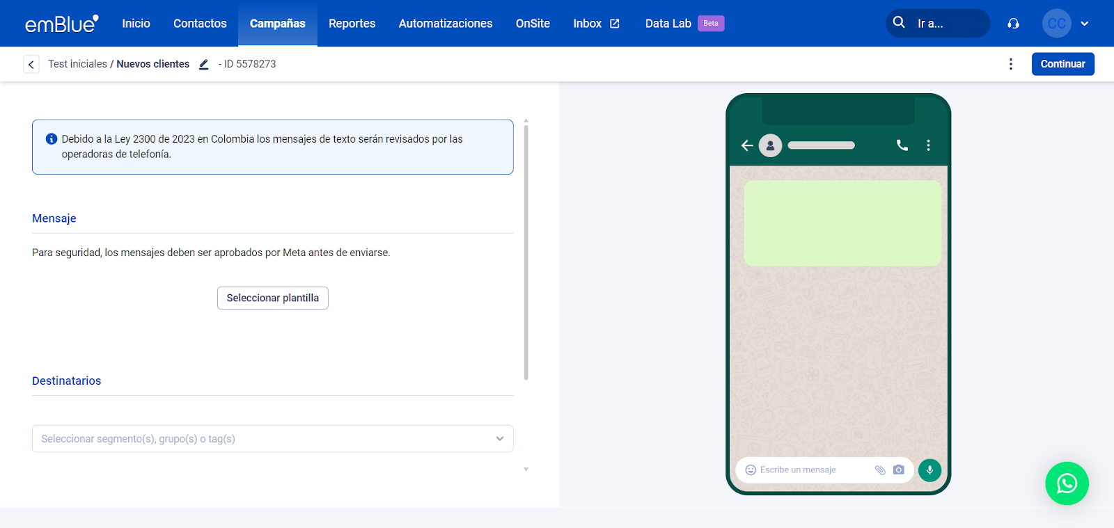 Una vez creas la acción, puedes seleccionar la plantilla pre aprobada por Meta que vayas a utilizar en el envío y seleccionar el grupo de destinatarios