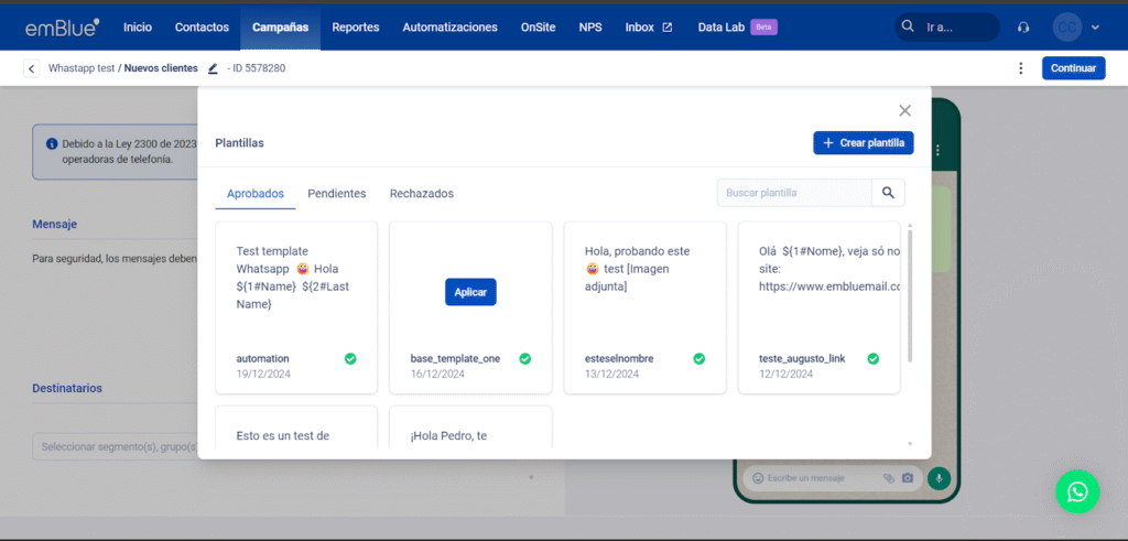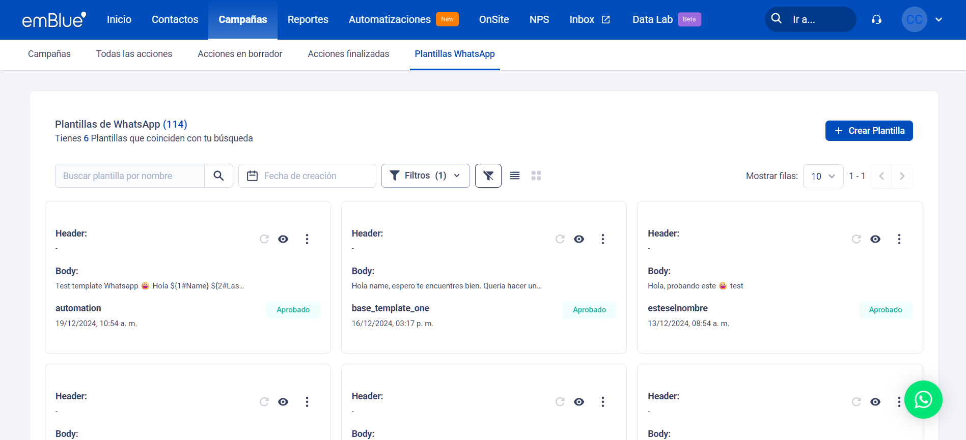 Desde la sección Campañas, tendrás la posibilidad de visualizar y gestionar de manera fácil, todas las plantillas creadas y sus diferentes estados, allí puedes filtrar por sus diferentes estados o por su fecha de creación, crear nuevas plantillas, visualizar el detalle y eliminarlas.