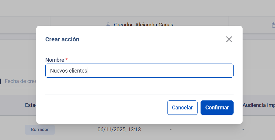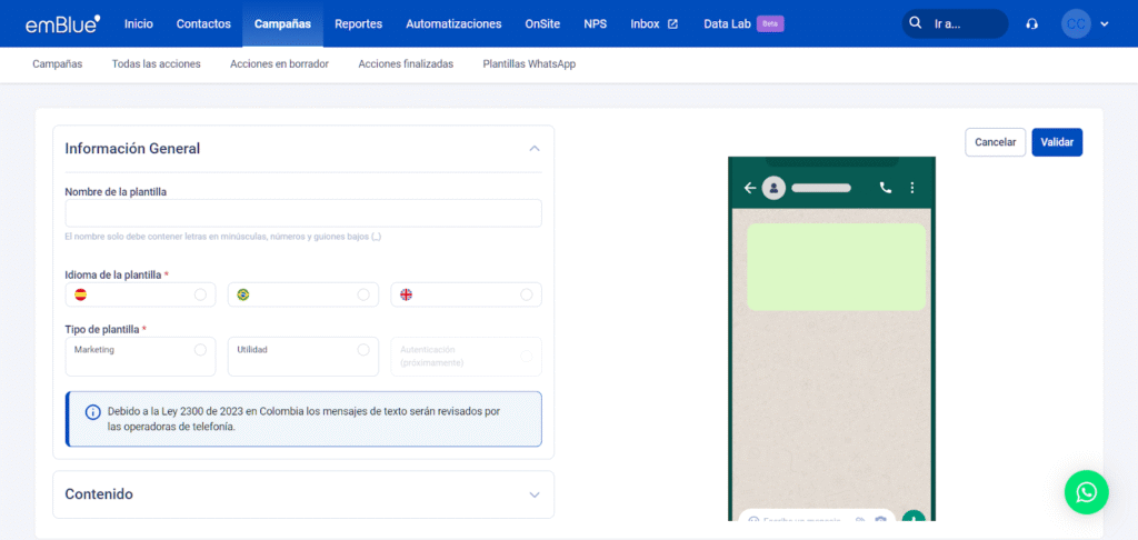 Desde la acción: Debes hacer clic en en el botón “Seleccionar plantilla” y luego en “Crear plantilla” Agregas un nombre con el que la identificarás posteriormente en tu galería. Luego puedes seleccionar el idioma en el que la vas a configurar (Español, Portugués o Inglés).