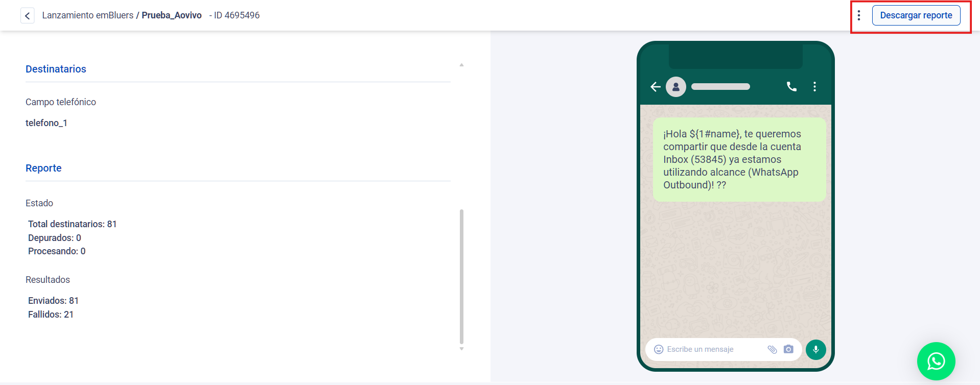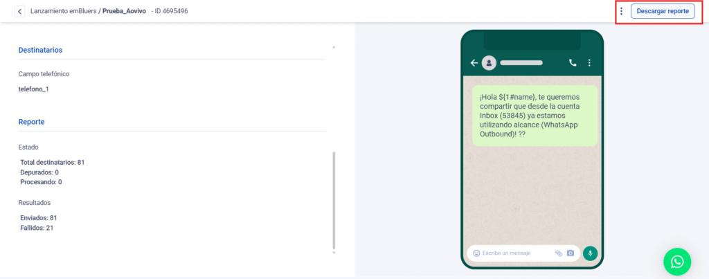 Una vez confirmas tu envío masivo de Whatsapp, podrás ingresar a la acción y visualizar el reporte. Encontrarás la cantidad de destinatarios del envío, depurados, procesando y los resultados de Efectivos y fallidos.