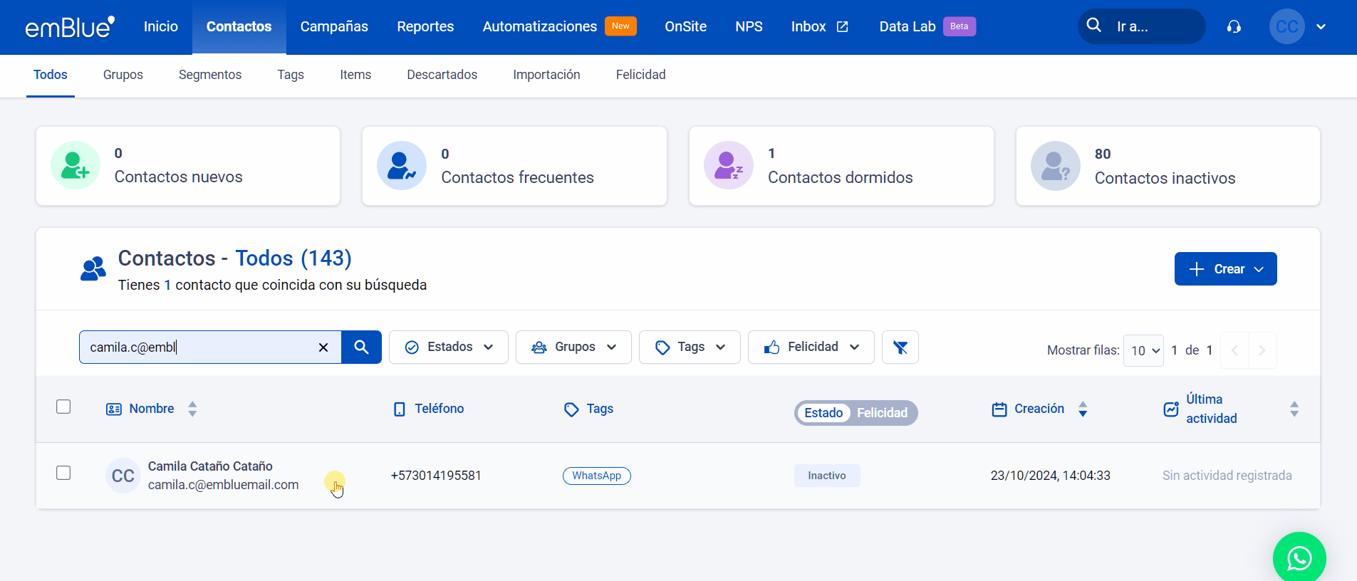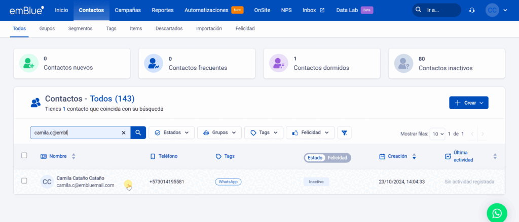 Desde emBlue, también tendrás la posibilidad de hacer envíos de manera individual a un contacto en específico. Para esto debes ingresar al perfil del contacto con el que requieres iniciar la conversación y encontrarás la opción, Contactar por WhatsApp, allí podrás seleccionar la plantilla que será enviada de inmediato al contacto.