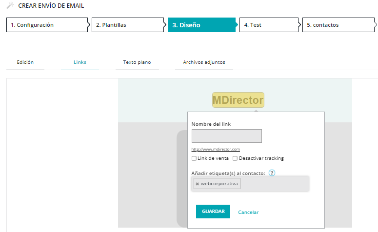 2.- Etiquetando los links de un envío de email marketing, se añadirá a cada usuario que haga click la etiqueta correspondiente en cada enlace etiquetado. Se puede realizar esta acción desde la pestaña «Links» del paso 3 «Diseño». Así podrás trackear esos contactos y segmentar tus listas en base a sus intereses.