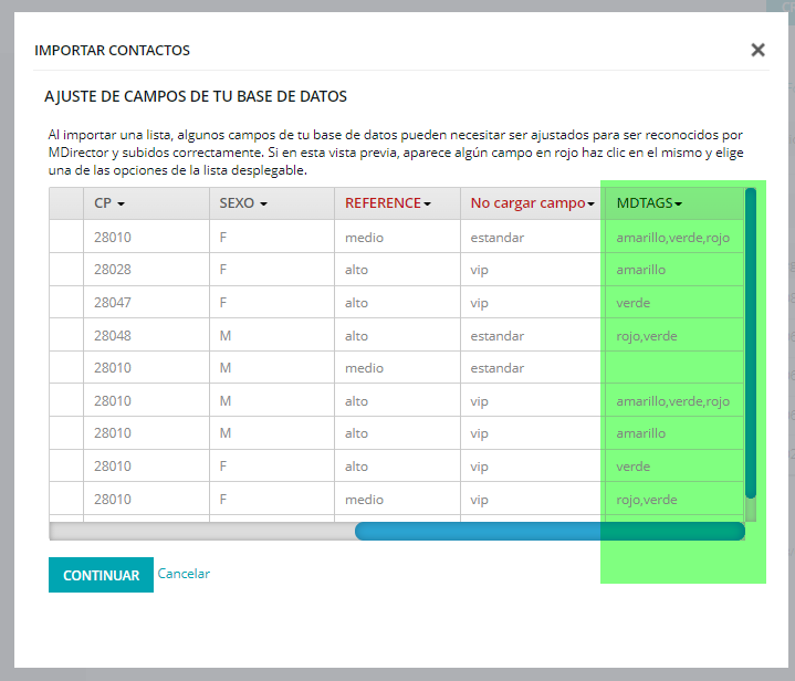 b) Al importar hay que asignarlo al campo MDTAGS: